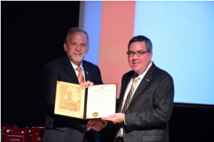Zoran Filipi (left) and Mike Davidson hold a copy of the JTEKT Endowed Fellowship agreement at a recent ceremony at CU-ICAR.