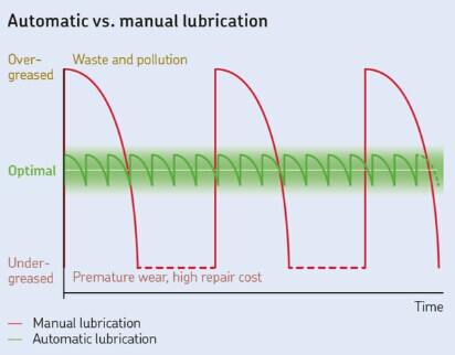 With an ALS, lubricant can be applied exactly when and where it’s needed while the machine is running. Manual lubrication, on the other hand, requires the machine to be stopped before lubricant can be applied, and may require a person to climb onto the machine which can be a safety issue.